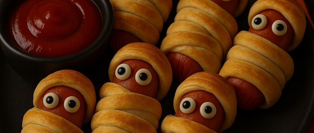 Cut crescent dough into thin strips and wrap each hot dog like a mummy, leaving small gaps for the “face.”